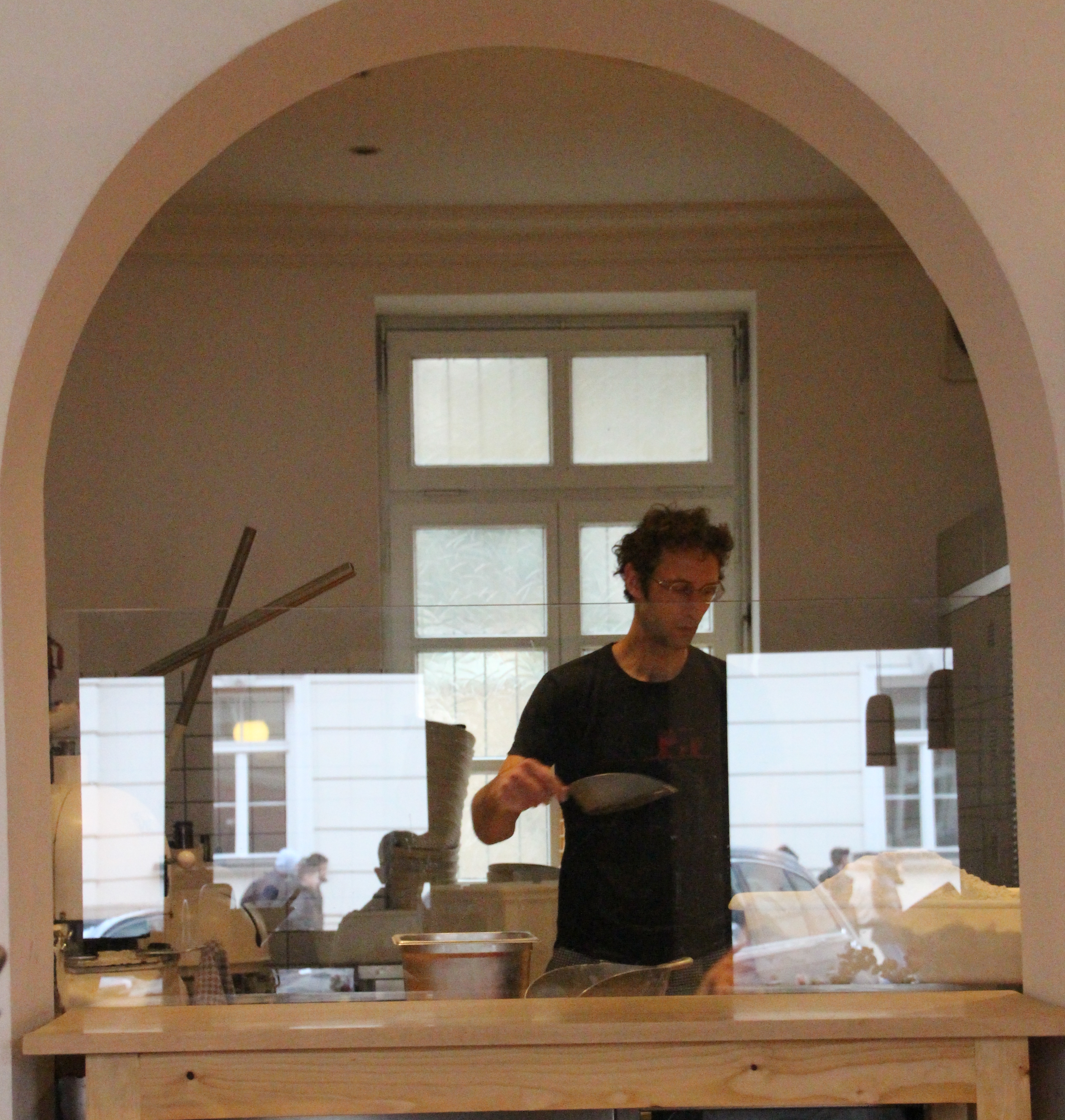 Die große, zentrale Massivholztheke des „Brotraumes“ setzt die Holzofen-Leckereien geschickt in Szene, ein gläserner Bogendurchgang ermöglicht einen Blick in die Backstube Mit Muße und Fleiß kneten die Mitarbeiter Hefeteig und formen Brezeln. Täglich bereiten sie ca. 100 – 150 Kilo Teig vor.