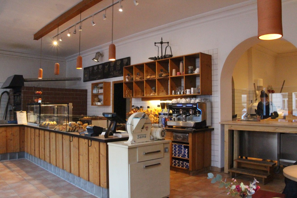… das geht kaum woander so gut as im „Brotraum“ im Münchener Stadtteil Schwabing. Der Name „Brotraum“ ist nämlich äußerst treffend für diese Kombi aus Backstube, Verkaufsraum und Café. Früh morgens sitze ich an einem der kleinen Tische in der holzvertäfelten Ecke des „Brotraums“. Ich genieße einen Cappuccino und einen frischen, ofenwarmen Zimtknoten. Aus der gegenüberligenden Ecke verströmt der Holzpellett-Ofen ein wohlriechendes Aroma aus frischem Brot und Kamingeruch. Ich wähne mich irgendwo in Skandinavien zwischen „Hygge“- und „Lagom“-Feeling und merke kaum, dass ich Mitten im exquisten Schwabing sitze.