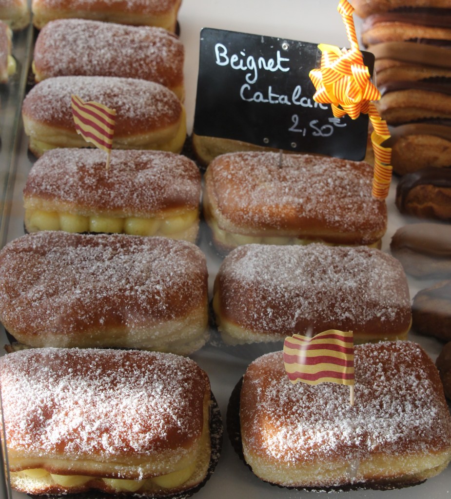 Die Verkäuferin empfiehlt mir als besondere Spezialität die „beignets catalans“. In der Tat eine Mischung französischer und katalanisch-/spanischer Einflüsse. Der Krapfenteig erinnert an die spanischen „churros“ und die Füllung besteht aus der klassischen, französischen „crème pâtissière“. Frisch ausgebacken schmecken sie gerade am frühen Morgen vorzüglich und nicht nur deshalb sind sie jeden Tag ziemlich schnell ausverkauft.