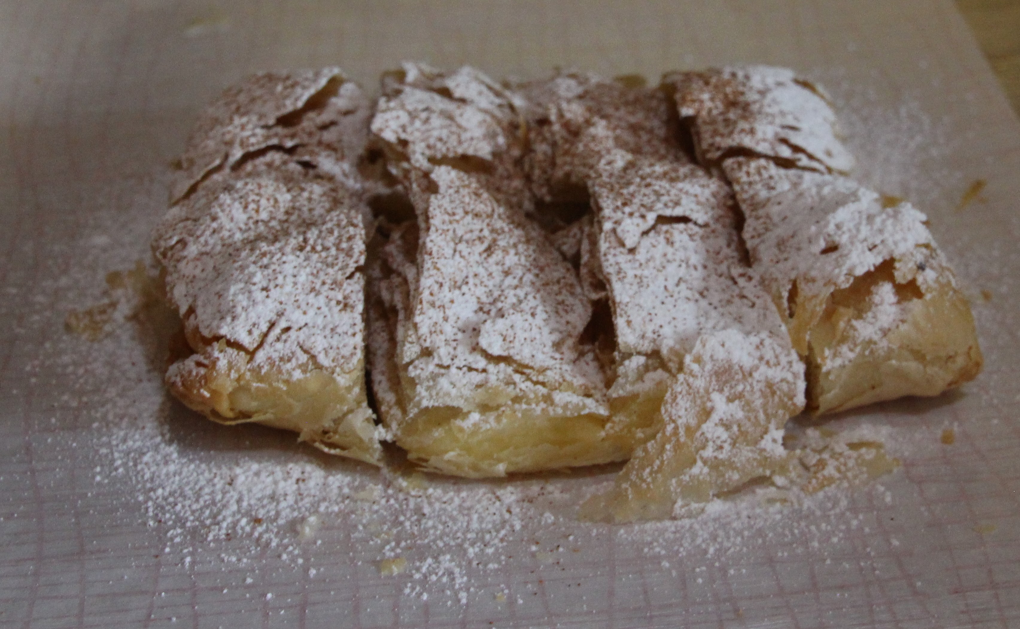 Auf die Frage nach seinem Lieblingsprodukt bin ich dann aber doch von der Antwort erstaunt: kein Roggensauerteig-, Pitabrot oder Änliches. Stolz kredenzt er mir seine „Bougatsa krema“, ein Überbleibsel seiner Lehrzeit im hierfür bekannten Thessaloniki. Und ich bin begeistert: Ein Blätterteigrechteck gefüllt mit Crème pâtissière, mit Puderzucker und Zimt bestreut und in acht kleine Häppchen zerteilt. Ich habe das Gefühl, ein riesige portugiesische „Pasteis de Nata“ zu essen.