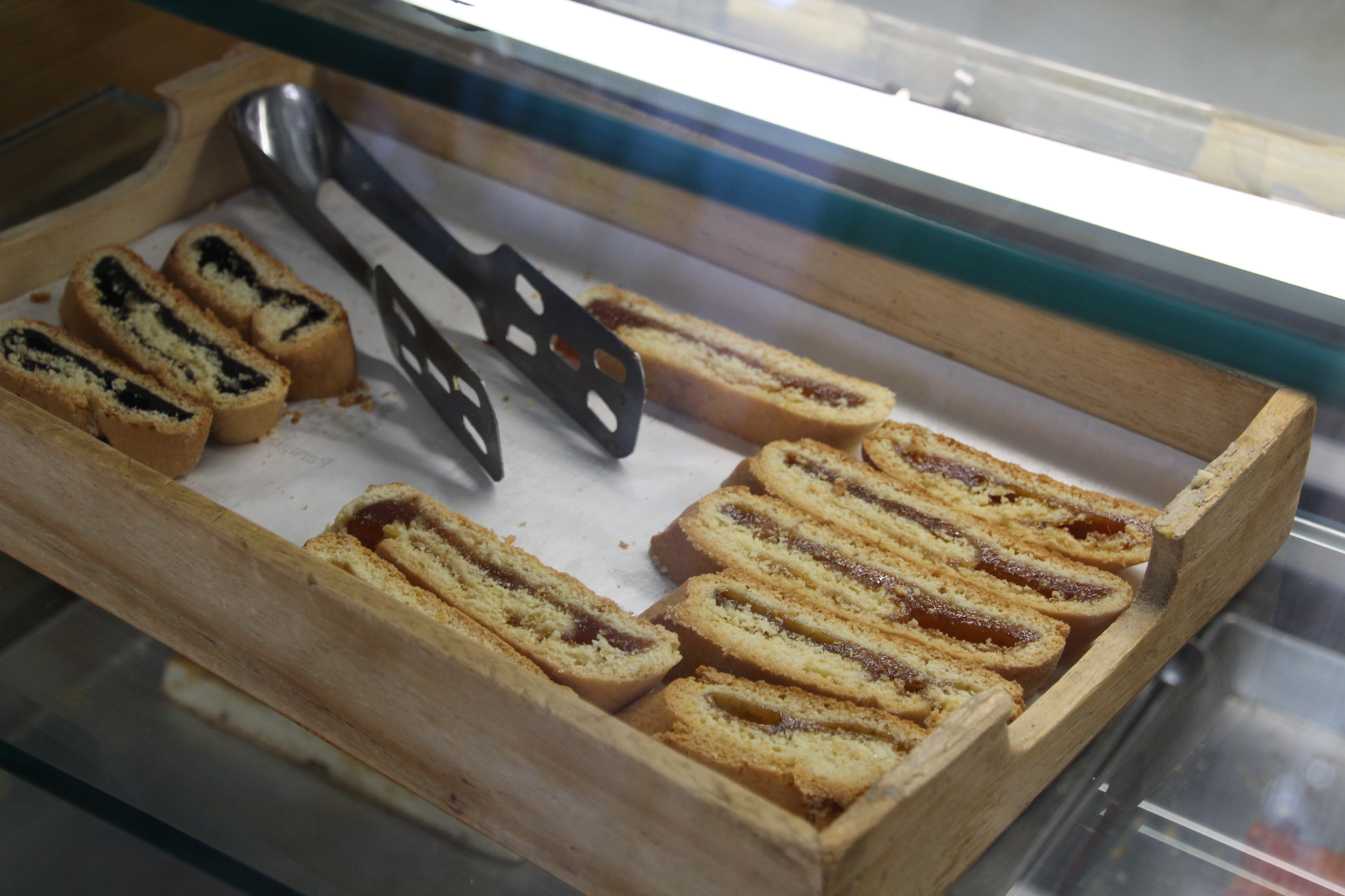 Im hinteren Teil der Backstube steht die gesprächige Nonna an einem großen Tisch und bereitet die Keksspezialitäten vor. Sie rollt eine riesige Portion Mürbeteig („pasta frolla“ aus Semola vor sich liegen und faltet mehrere Strudel: Aus kleinen abgestochenen Portionen werden zuerst große Platten ausgerollt, die dann mit Feigenmarmelade bestrichen oder Trockenfrüchten belegt werden. Zusammengerollt und nach kurzem Backen in feine Streifen geschnitten, sind die biscotti della nonna in wenigen Minuten fertig.