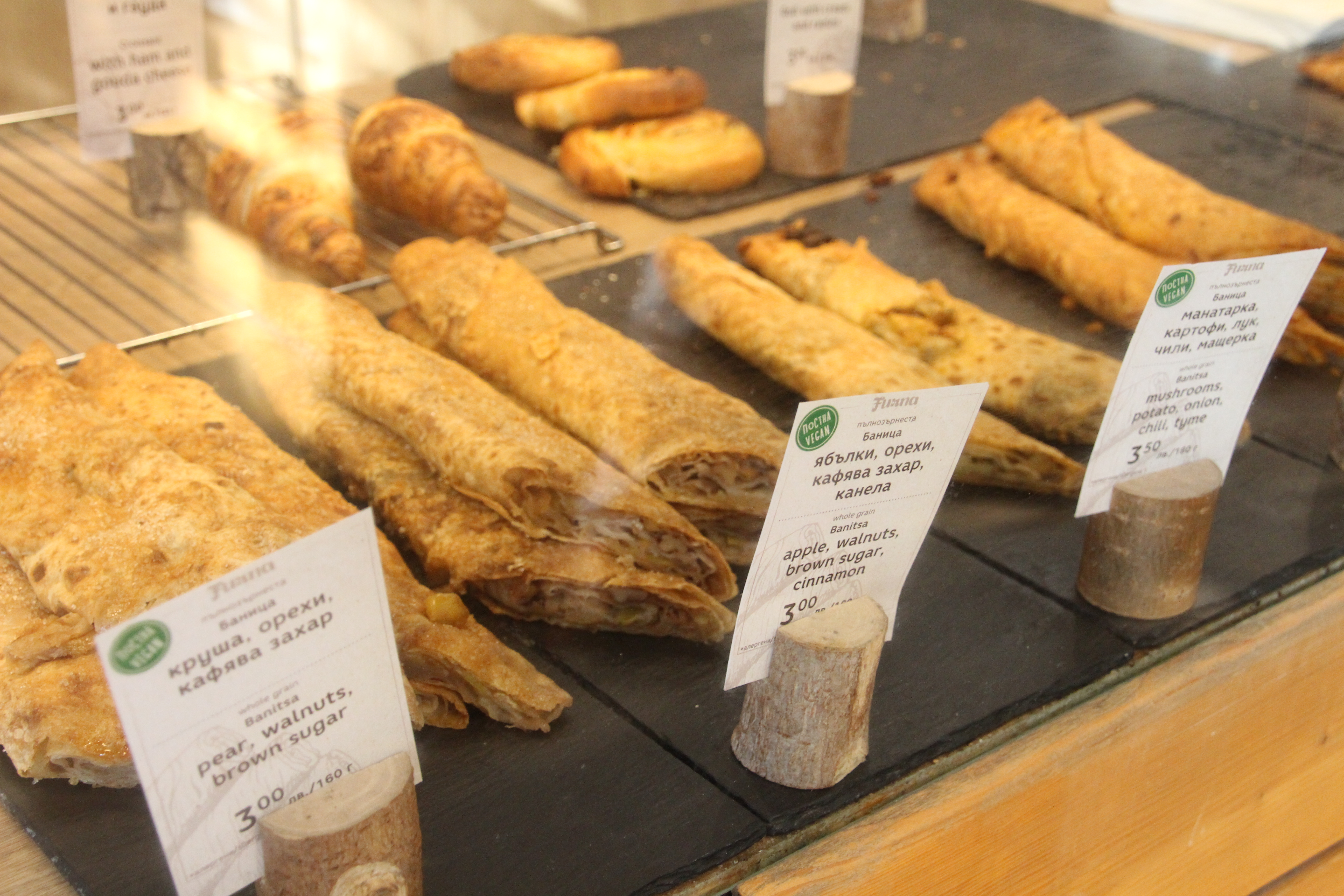 Moderner und gemütlicher Laden mit viel Holz, kleiner Kaffeebereich mit Außenterrasse. Ihre Hauptspezialitäten: Sauerteig-„Einkornbrot“, das von einem eigens dafür angestellten Bäcker zubereitet wird und Banitza mit Vollkorn-Filouteig. Für diese Banitza-Variante fahren viele Kunden extra durch die ganze Stadt, am beliebtesten ist die Tomaten-Basilikum-Füllung.