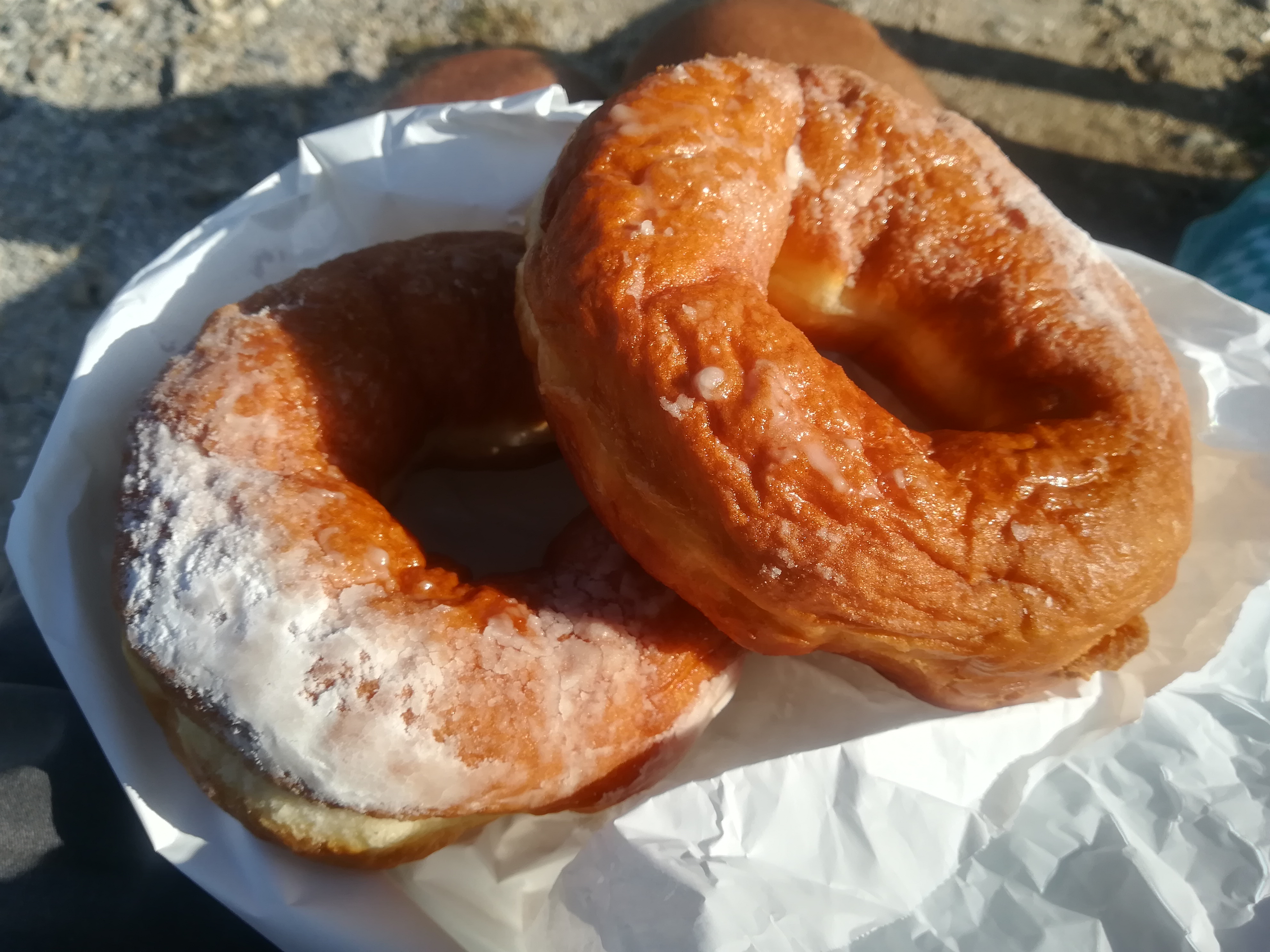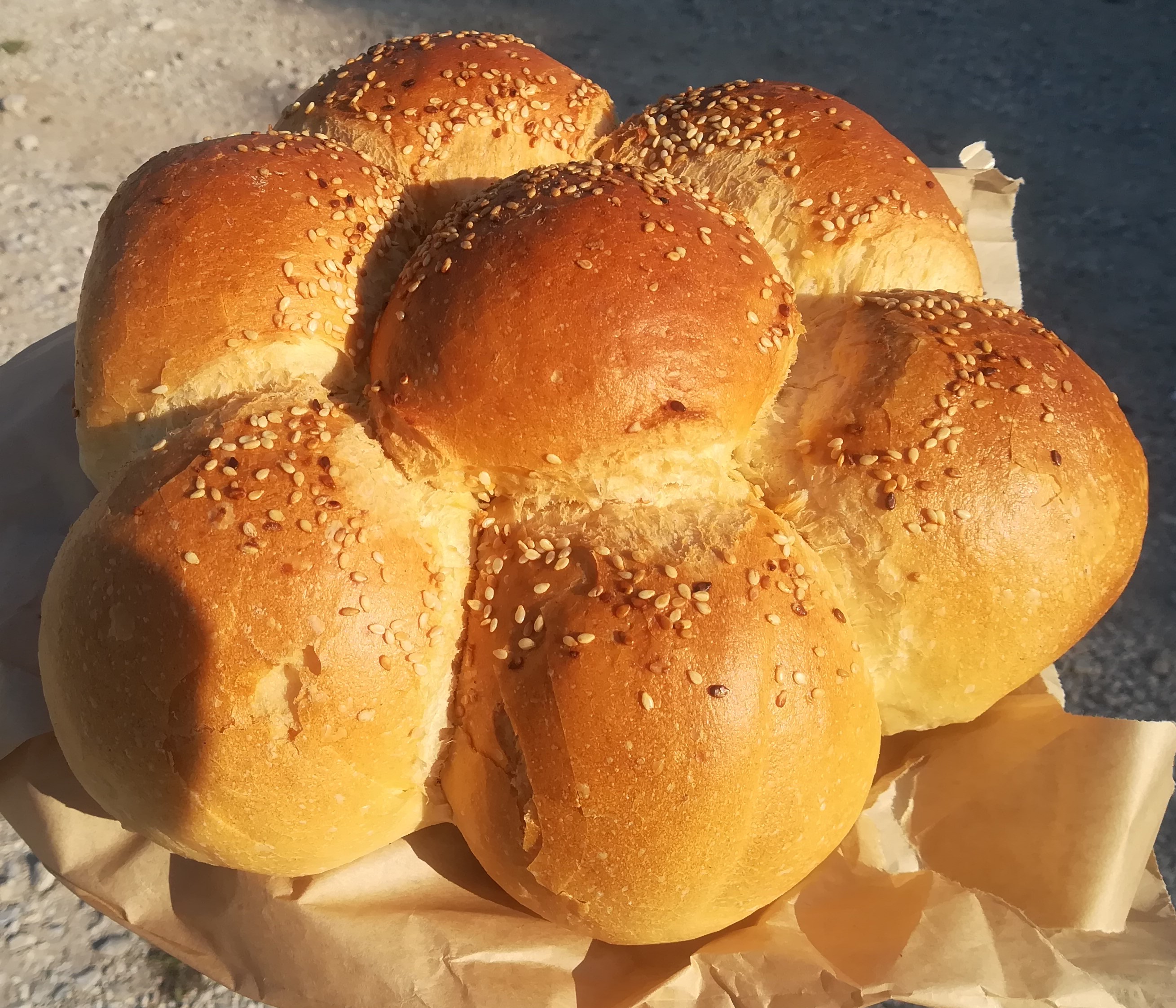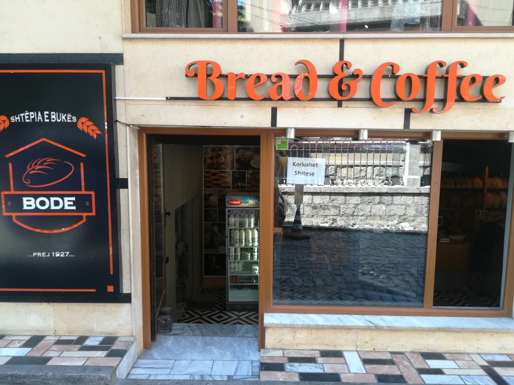 Korçë im Nordosten Albaniens ist vom Stadtbild und der Atmosphäre anders als Tirana oder Shkoder und beim Spaziergang stoße ich per Zufall auf die Bäckerei „Bode“ mit reichhaltigem Sortiment. Neben den üblichen Weißbroten bietet er Brötchen und diverse Kekse aber auch Grissini an. Noch dazu spricht der Bäcker ein klein wenig Englisch und kann mir zumindest verraten, dass seit 1927 in der direkt angrenzenden Backstube gebacken wird. Als besondere Spezialität verkauft er mir „petulla“, die auf dem Balkan weit verbreiteten Krapfen. Er macht sie jedoch nicht in Fladenform sondern als Kringel. Außerdem probiere ich bei ihm das „buke ne shtepi“, was ich schon mehrmals im Land gesehen habe und aufgrund seiner Form spannend fand. Sieben (Milch-)Brötchen werden im so genannten „Tepsi“, einem runden, oftmals mit einem Deckel verschlossenen Blech, im Holzofen gebacken. Durch die runde Form entsteht ein Rad bzw. eine Blume, von der man nach und nach ein Brötchen abtrennen kann.