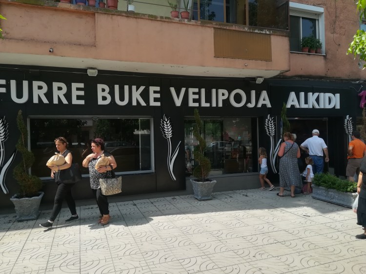 Da Montenegro keine backtechnische Entdeckung gewesen ist, liegt meine Hoffnung nun auf Albanien. Bereits das Brot zum Frühstück am Skutari-See ist deutlich besser. Auf der Suche nach der Bäckerei stoße ich auf ein Namen- und Adressen-Wirrwarr in der nahegelegenen Stadt Shkoder. Es gibt vier Filialen und per Zufall parken wir fast direkt bei der „Furre Buke Velipoja Alkidi“. Der Andrang vor dem Laden ist trotz 38 Grad im Schatten groß. Leider scheitert mein Versuch mehr Informationen zu erhalten an den nicht vorhandenen Englischkenntnissen der VerkäuferInnen – was bislang in Albanien oft der Fall ist. Das Standardbrot, ein rundes Weizenweißbrot, ist knusprig, luftig und sehr schmackhaft. Typisch ist auch das so genannte „Kukuruzu“, ein recht festes Maismehlbrot, das auf den ersten Blick einem kleinen Tortenboden ähnelt.