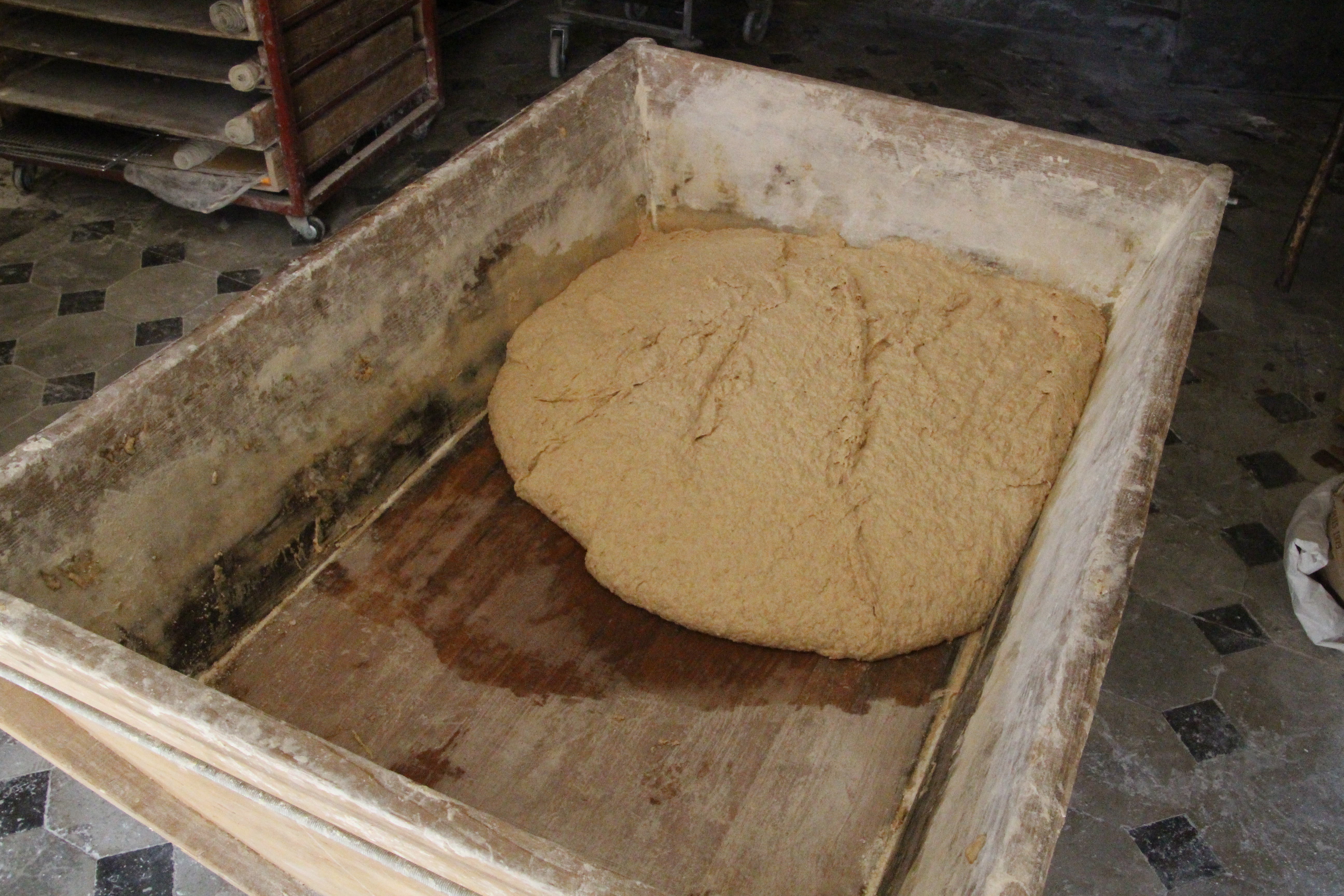 Vieles erinnert mich an mein Praktikum in der Normandie. Holztröge zum Teigkneten, ein alter Holzbackofen, der Geruch von Feuer, Sauerteig und frisch gebackenem Brot liegen in der Luft. Die fertigen Teige ruhen in den typischen Kunststoffwannen und warten darauf geformt und zu Brotleiben ausgebacken zu werden. Mit dabei das momentane Trendbrot in Frankreich, „le petit épeautre“ aber auch das klassische „semi-complète“ oder reines Vollkornbrot. Eine Besonderheit: Brot mit Traubensaft. Statt Wasser wird reiner Traubensaft verwendet. Man benötigt etwas mehr Sauerteig, da der Saft die Fermentation bremst. Eine Mischung aus Weizenbrot und Lebkuchengeschmack – passt hervorragend zu einer Terrine oder foie gras.