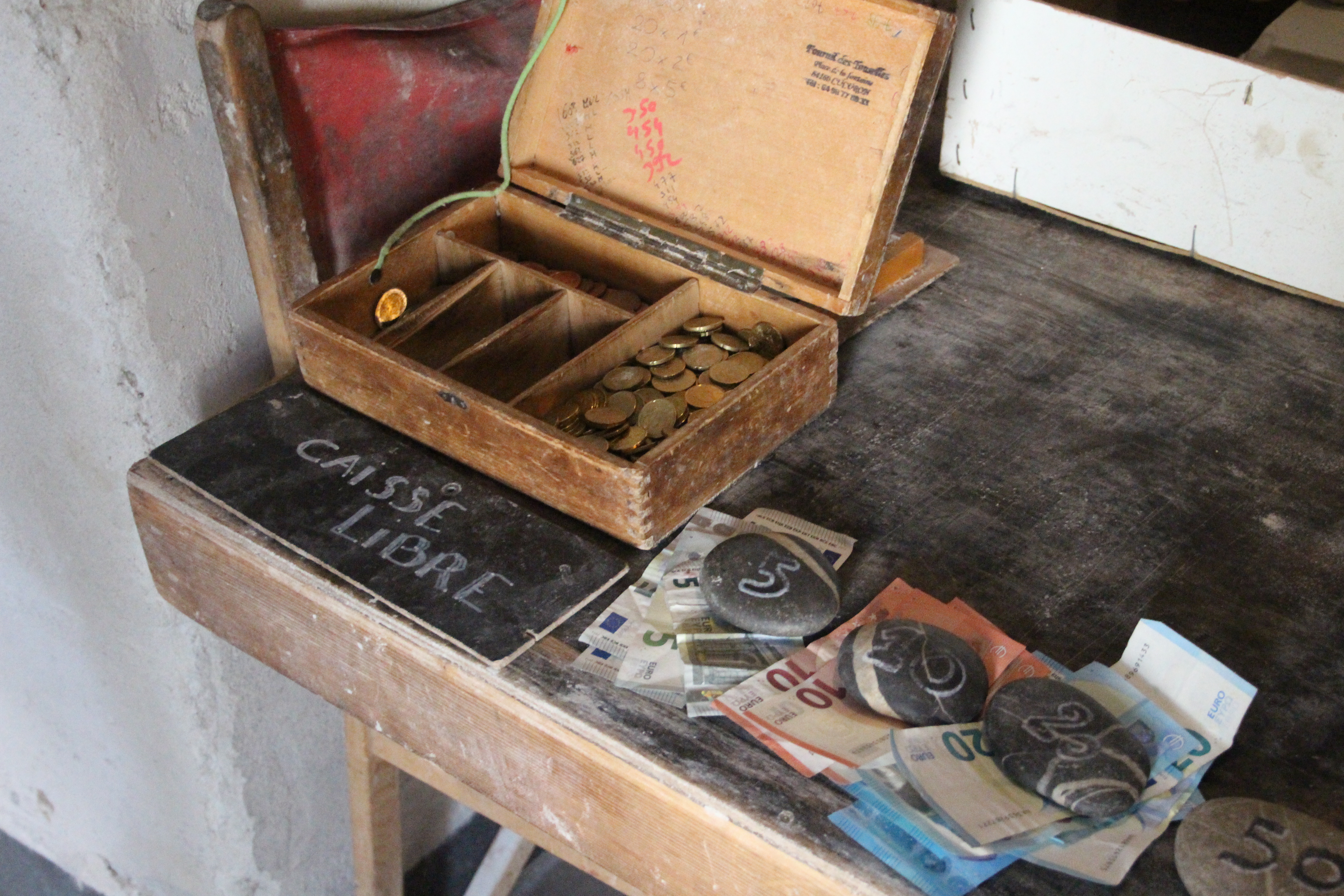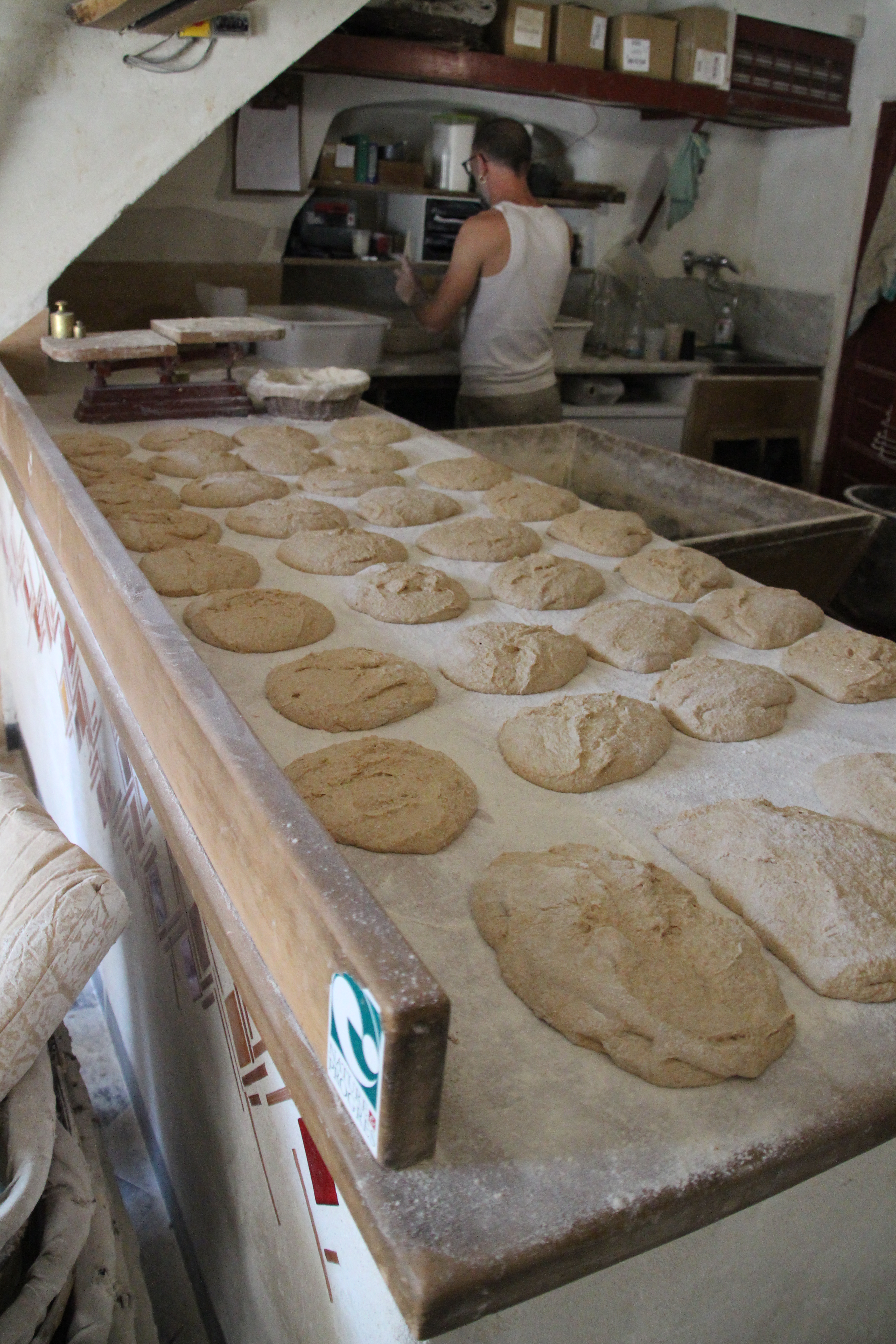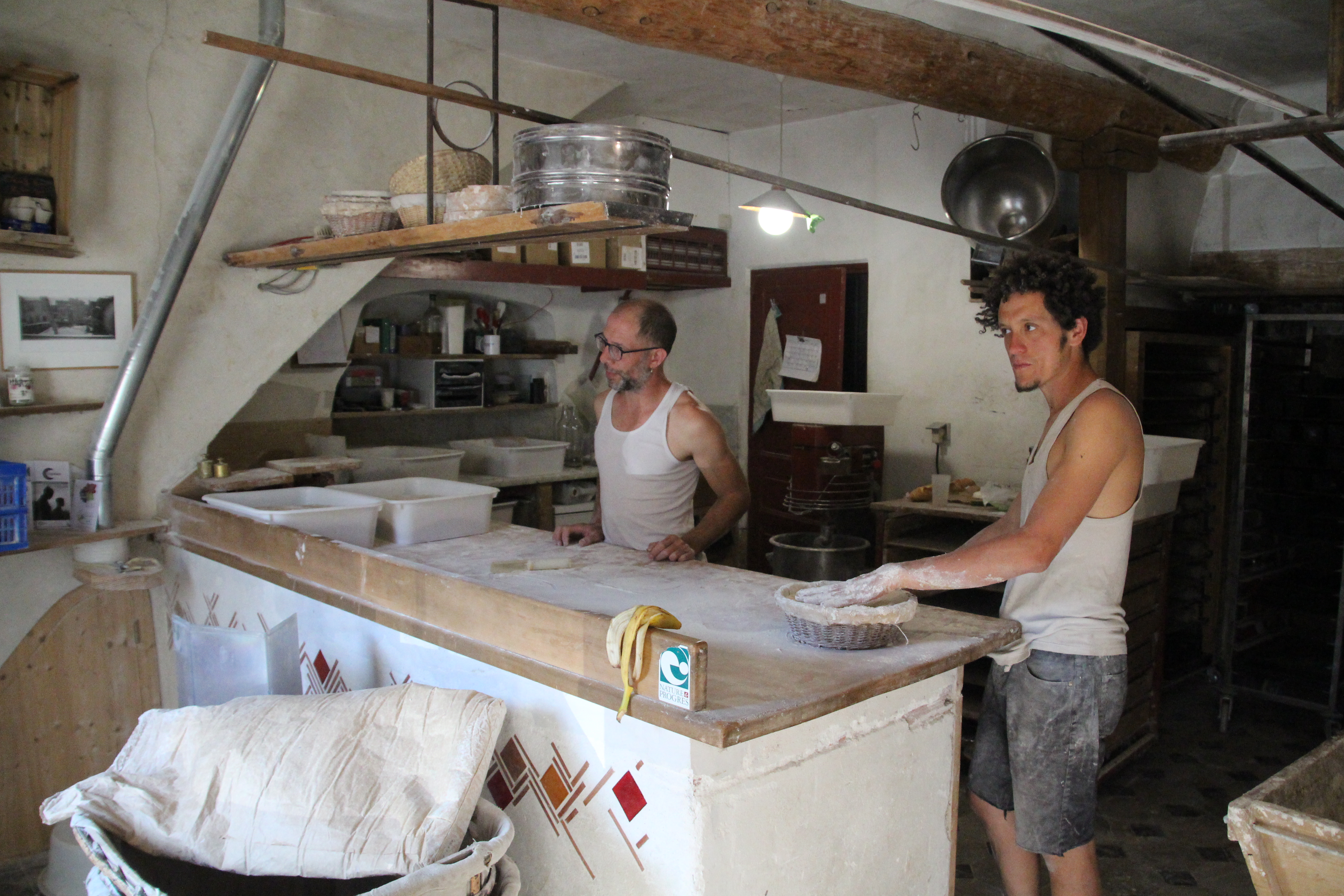 Man muss Glück haben, einen Blick in die alte Dorfbackstuben werfen zu können, denn es wird nur montags, mittwochs und freitags gebacken. Wer sicher sein will, ein Bort zu bekommen, gibt am Vortag seine Bestellung telefonisch auf. Ich lerne Benoît und seinen kolumbianischen Mitarbeiter kennen. Er ist gleichzeitig Getreidebauer und verarbeitet selbstverständlich sein eigenes Mehl. Nachdem ich ihnen beim „pétrissage“ und „façonnage“ zusehen kann, komme ich am Nachmittag zum Verkauf wieder – um die fertigen Brote begutachten und kosten zu können. Dabei bin ich nicht der Einzige. Ab 16 Uhr 30 bildet sich eine lange Kundenschlange, die bis Ladenschluss gegen 19 Uhr nicht abreißt. Bezahlt wird unkonventionell an einer Vertrauenskasse, aus der man sich eigenhändig sein Wechselgeld nimmt – eine sympathische Geste nebenbei.