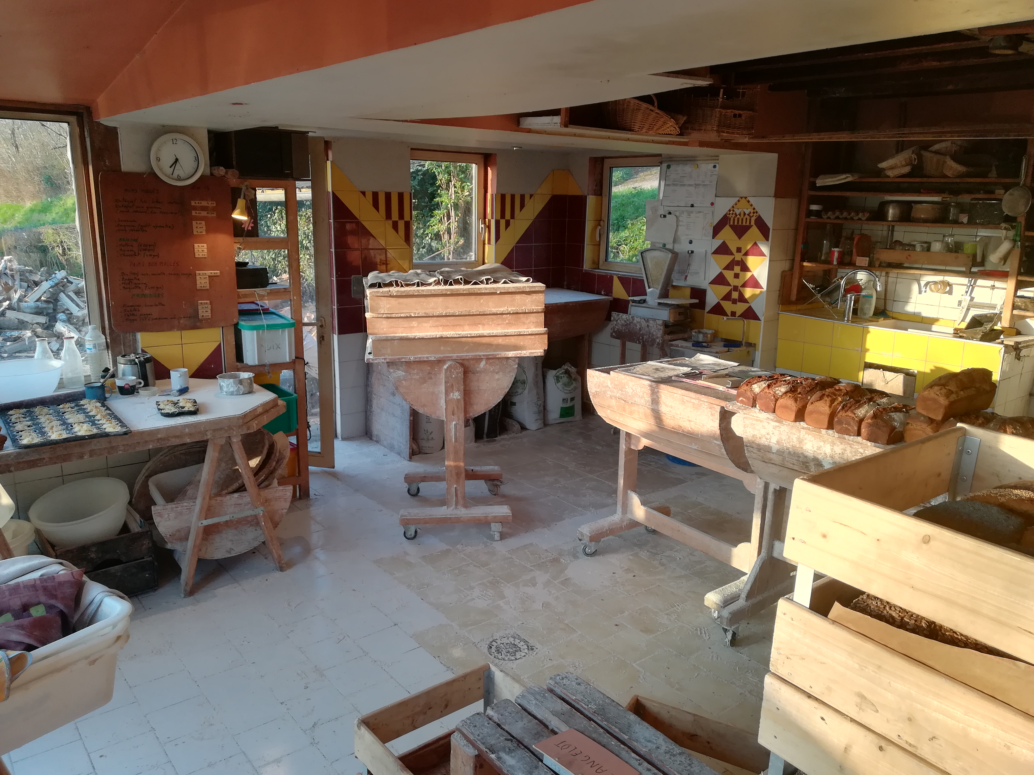 So empfangen mich an meinem ersten Tag Mathilde und Nico, zwei der insgesamt sieben Genossenschaftler. Ich bekomme kurz die Räumlichkeiten gezeigt und schneller als ich schauen kann, habe ich meine Hände in der Teigschüssel (eigentlich ein zu niedlicher Begriff für die großen Holztröge) und starte mit dem Kneten. Das bereits will gelernt sein … Aber der Reihe nach: Ich wohne in einer kleinen Kammer über der Backstube mitten im Grünen, am gegenüberliegenden Hang ragt hinter den Bäumen die Spitze der Dorfkirche heraus, daneben sieht man die obligatorische „mairie“ (erst später erfahre ich, dass sie nicht mehr als solche fungiert und die beiden Etagen als Wohnung an zwei der Bäcker vermietet werden). Um mich herum nur Wiesen, Apfelbäume … und Esel (als Rasenmäherersatz). Sie gehören zum Konzept, das Erik – ein durchgeknallter Holländer – vor 30 Jahren ins Leben gerufen hatte. Er wohnt mit seiner „Compagne“ (Lebensgefährtin), Monique, im Nachbarhaus, ist leidenschaftlicher Musiker, kümmert sich um seine Tiere, seine Obstbaumwiesen, sein Aufforstungsprojekt und natürlich auch um die Backstube. Erik hat sich eine Oase und gleichzeitig ein Projekt für Aussteiger geschaffen: ein wenig Hippie, etwas mehr Öko, eher links als rechts und offen für alles und jeden. „Freunde“ die in Harmonie zusammenarbeiten und weniger ans „große Geld-Verdienen“ denken, wie er es beschreiben würde. Ein Gegenentwurf, der aufgeht.