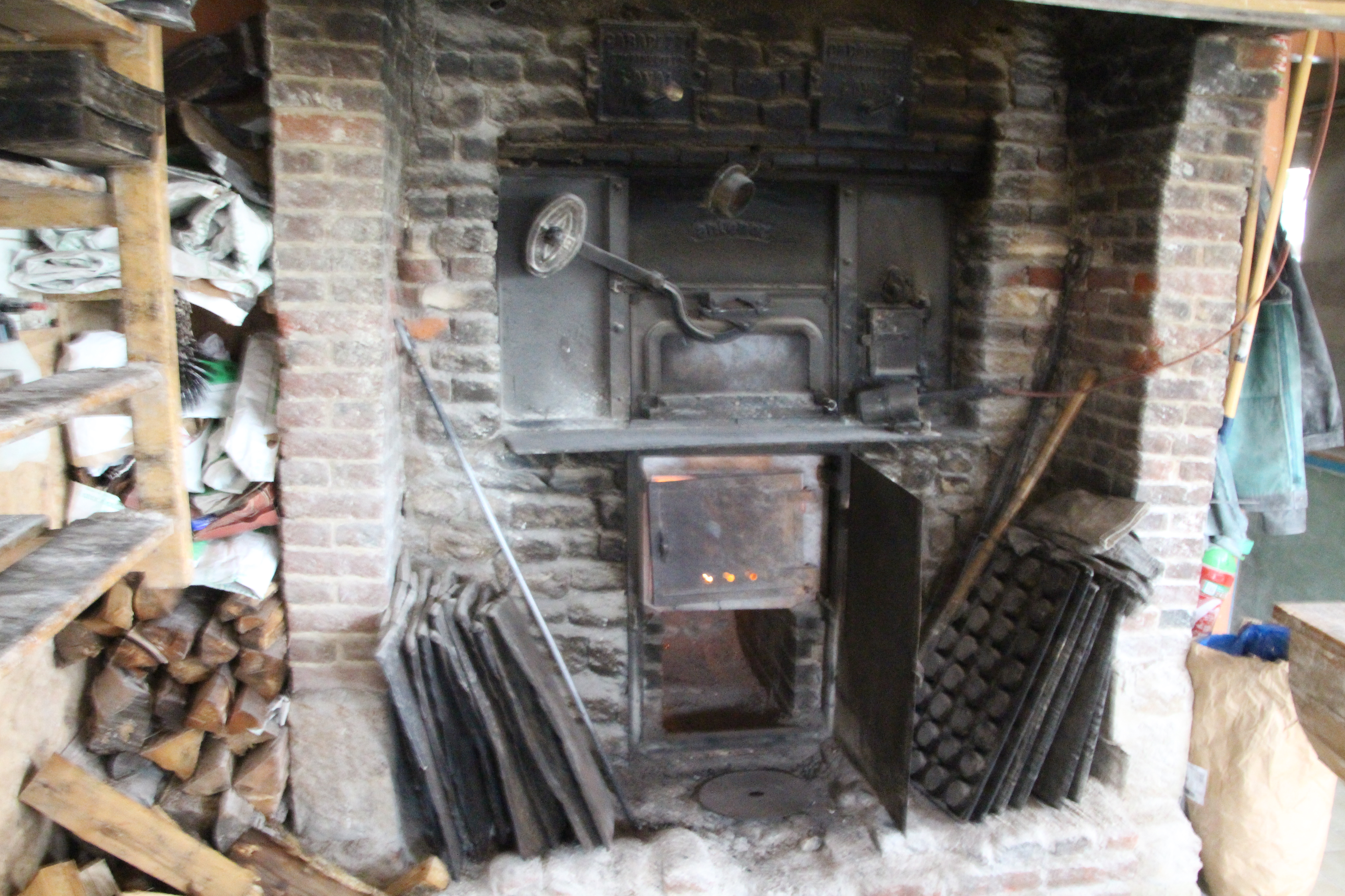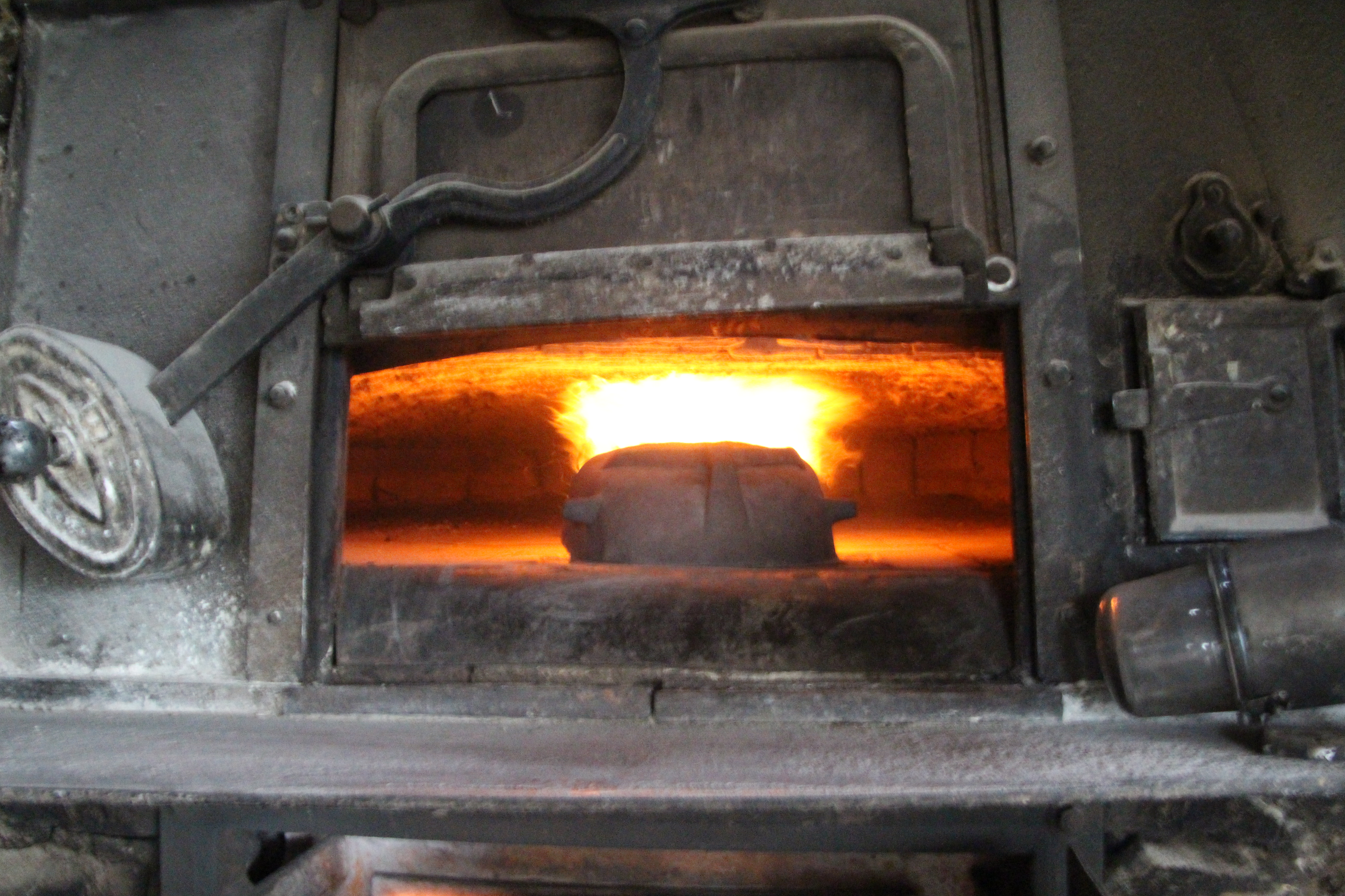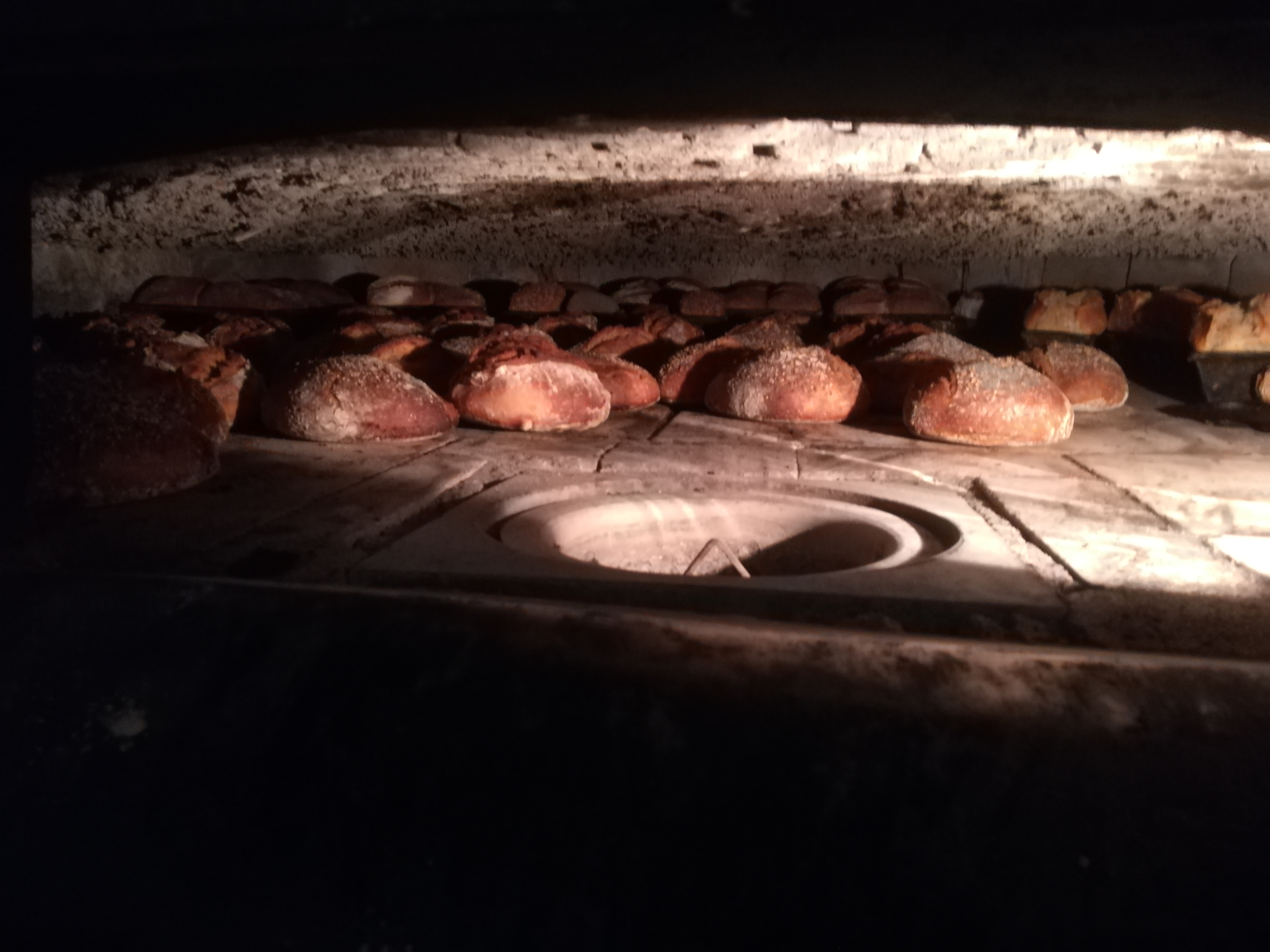 Natürlich gibt es bei den „Copains“ auch einen besonderen Ofen: den „four à gueulard“ (wörtlich übersetzt „Großmaulofen“). Die Vulkansteine im Inneren dieses 100-jährigen Ofens werden durch die darunterliegende Feuerstelle erhitzt. Damit die Wärme sich gleichmäßtig im Inneren verteilt befindet sich im vorderen Bereich eine runde Öffnung. Sie wird zum Anheizen des „Gueulard“, einer halbrunden, nach vorne hin geöffnete Gusseisenkappe bedeckt. Wie aus einem Schlund schießen die Flammen heraus und heizen den Ofen auf 300 bis 400 Grad. Eineinhalb Stunden braucht man, um eine gleichmäßig verteilte Wärme zu erreichen und um mit dem Backvorgang starten zu können. Was so kinderleicht aussieht ist auch hier gar nicht so einfach: Der Platz im Ofen muss gut ausgeschöpft werden, damit alle Teiglinge reinpassen. Davor werden sie mit der richtigen Technik eingeritzt und auf dem gut bemehlten Brotschieber so positioniert, dass sie im Inneren ruckartig auf die heißen Steine geschoben werden können. Mit etwas Übung habe ich es auch ganz gut hinbekommen, hin und wieder bekamen meine Brot aber einen „baiser“, weil sie sich beim Runterschieben berührten.