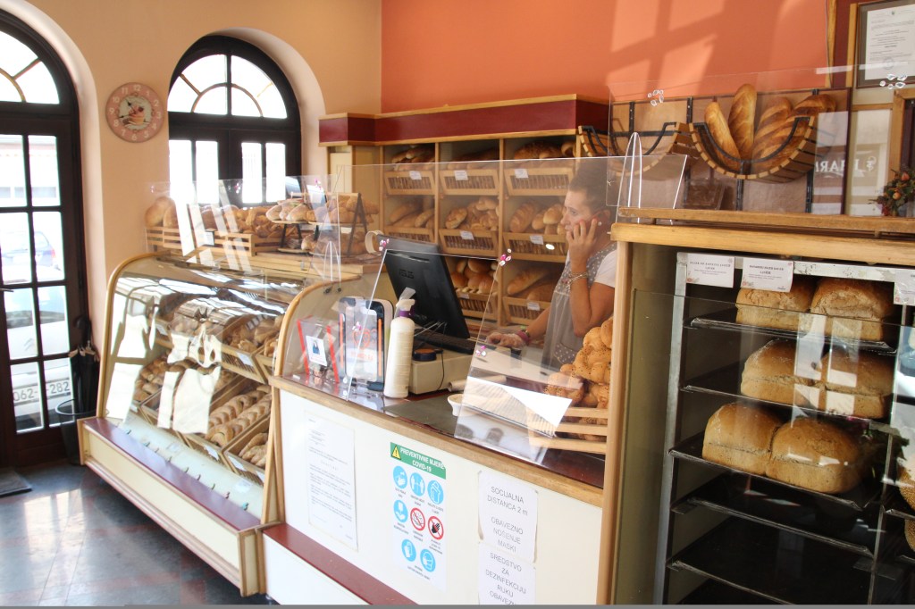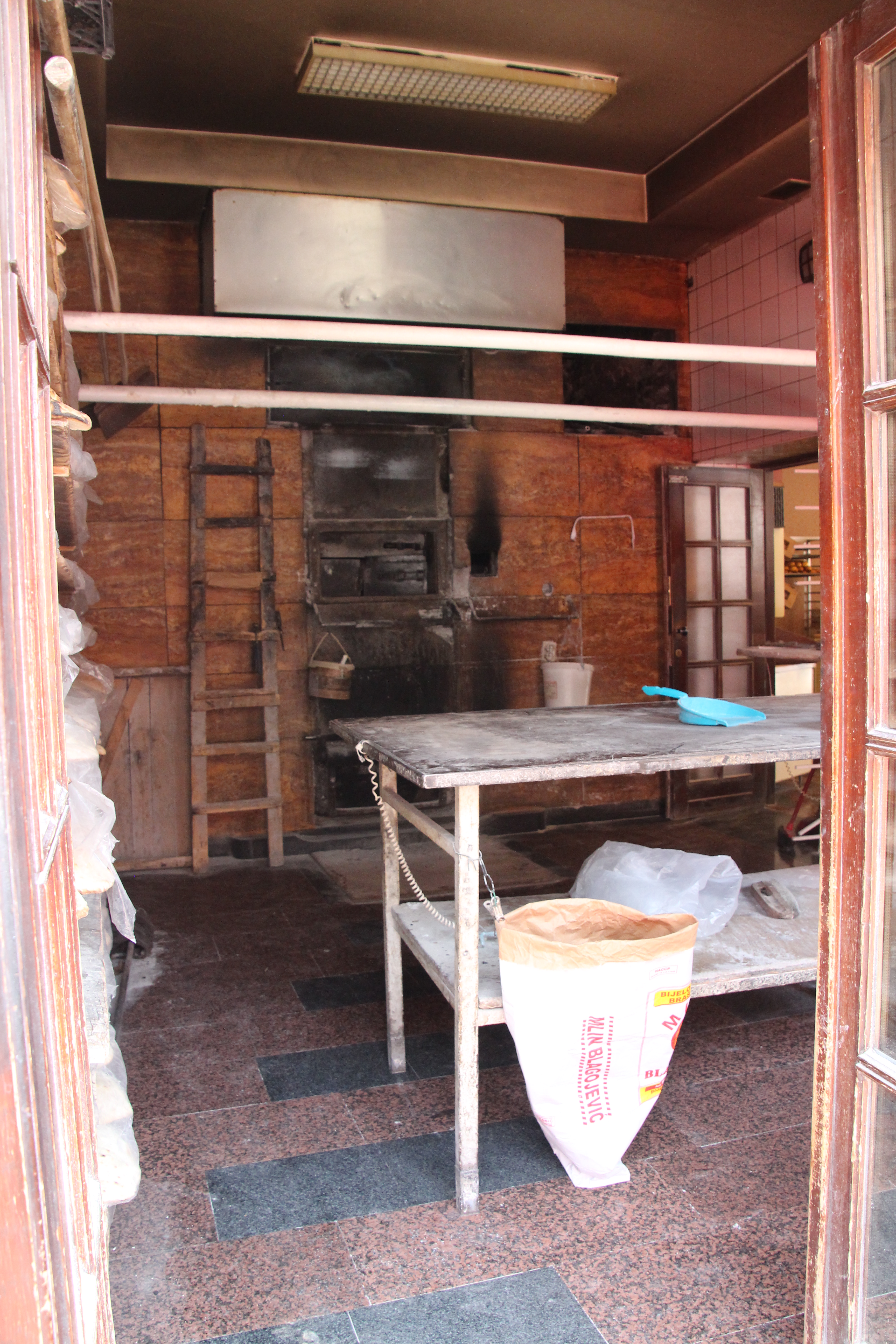 In der Bäckerei angekommen, macht die Auslage neugierig. Die Verkäuferin spricht kein Englisch, ruft aber direkt ihren Neffen an. Kurzdrauf habe ich einen Termin um 12 Uhr mit dem Enkel des Bäckereigründers… Das Herzstück der Bäckerei Poričanin ist der fast 70 Jahre alte Holzkohleofen. Täglich bäckt er bei ca. 500 Grad Celsius in sekundenschnelle hunderte „Somuns“: bosnische Fladenbrote (andernorts auch „Lepinje“ genannt) – die Spezialität der Bäckerei. Vor allem zum Bajram-Fest stehen die Leute aus der ganzen Stadt für dieses Brot an. „Das gesündeste Brote, dass wir backen: nur Wasser, Mehl, Hefe. Und alles handgemacht.“ Beteuern sowohl Vater (Hauptbäcker) und Sohn. Ich glaube es ihm direkt, denn bei dem kurzen Rundgang durch die Backstube fallen mir nur drei Knetmaschinen (ein wenig nachgeholfen wird also doch) und ein moderner Ofen für die übrigen Backwaren auf. Die können sich ebenso sehen lassen. Auf Reisen nach München, Stuttgart und Paris hat sich der Bäcker inspiriert und experimentiert gerne mit Dinkel, Maismehl und diversen anderen natürlichen Zutaten.